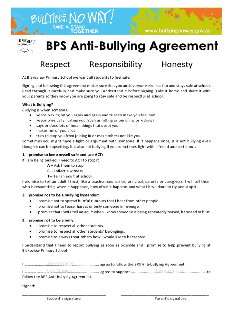 BPS AntiBullying Agreement RespectResponsibilityHonestyAt Blakeview Primary School we want all students to feel safe. Signing and following this agreement makes sure that you and everyone else has