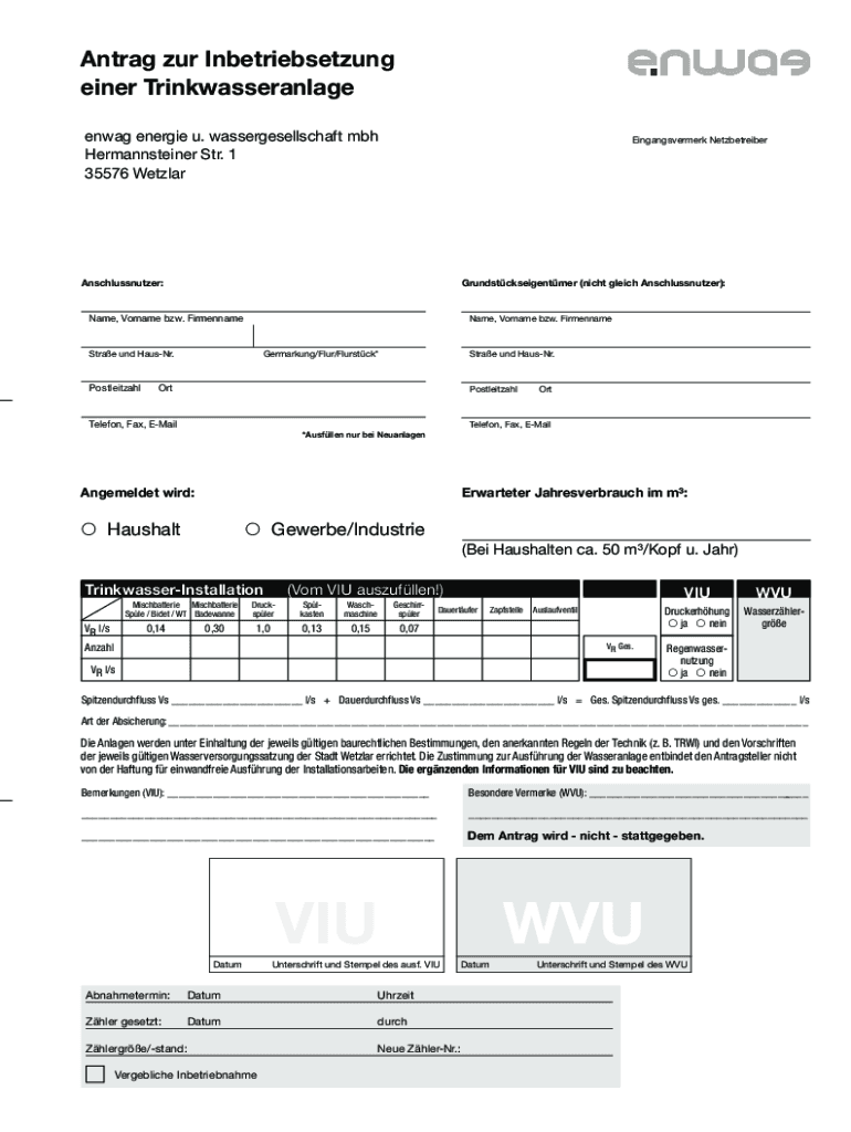 Antrag zur Inbetriebsetzung einer Trinkwasseranlage enwag energie u. wassergesellschaft mbh Hermannsteiner Str. 1 35576 WetzlarEingangsvermerk NetzbetreiberAnschlussnutzer:Grundstckseigentmer (nicht