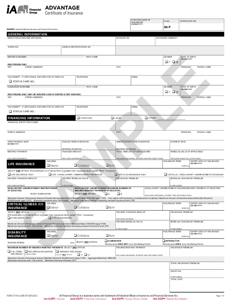 ADVANTAGECertificate of Insurance EFFECTIVE DATE OF INSURANCEPLANDD/MM/YYYYCERTIFICATE NO.84PINSURER: Industrial Alliance Insurance and Financial Services Inc.GENERAL INFORMATION GROUP POLICYHOLDER