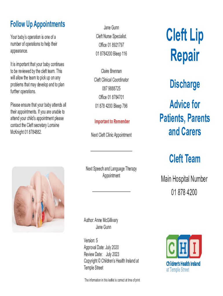 Follow-Up Appointments Your babies operation is one of a number of operations to help their appearance. It is important that your baby continues to be reviewed by the cleft team. This will allow the