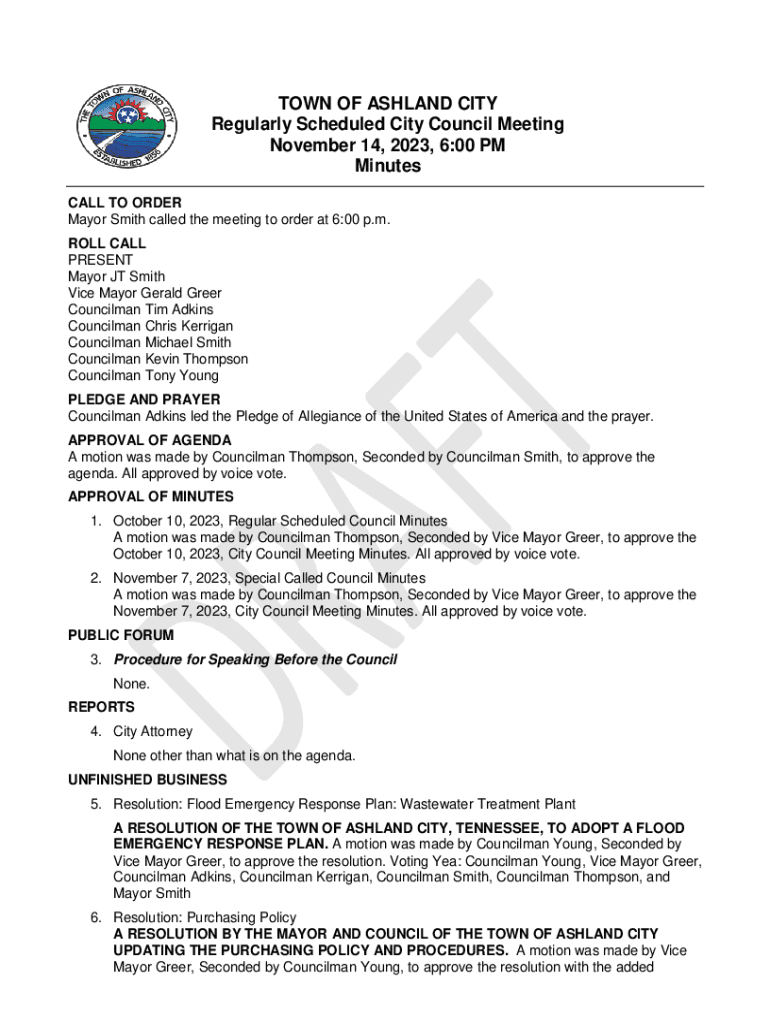 TOWN OF ASHLAND CITY Regularly Scheduled City Council Meeting November 14, 2023, 6:00 PM Minutes CALL TO ORDER Mayor Smith called the meeting to order at 6:00 p.m. ROLL CALL PRESENT Mayor JT Smith