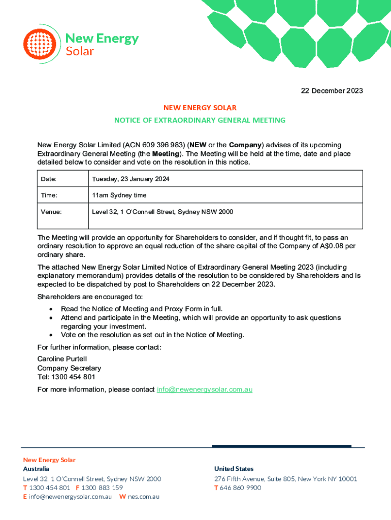 22 December 2023NEW ENERGY SOLAR NOTICE OF EXTRAORDINARY GENERAL MEETING New Energy Solar Limited (ACN 609 396 983) (NEW or the Company) advises of its upcoming Extraordinary General Meeting (the