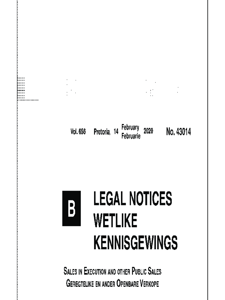 Vol. 656Pr t ri e0 af14 February 2020 FebruaneNo. 43014LEGAL NOTICES WETLIKE KENNISGEWINGS SALES IN EXECUTION AND OTHER PUBLIC SALES GEREGTELIKE EN ANDER QPENBARE VERKOPE2 No. 43014GOVERNMENT GAZETTE,