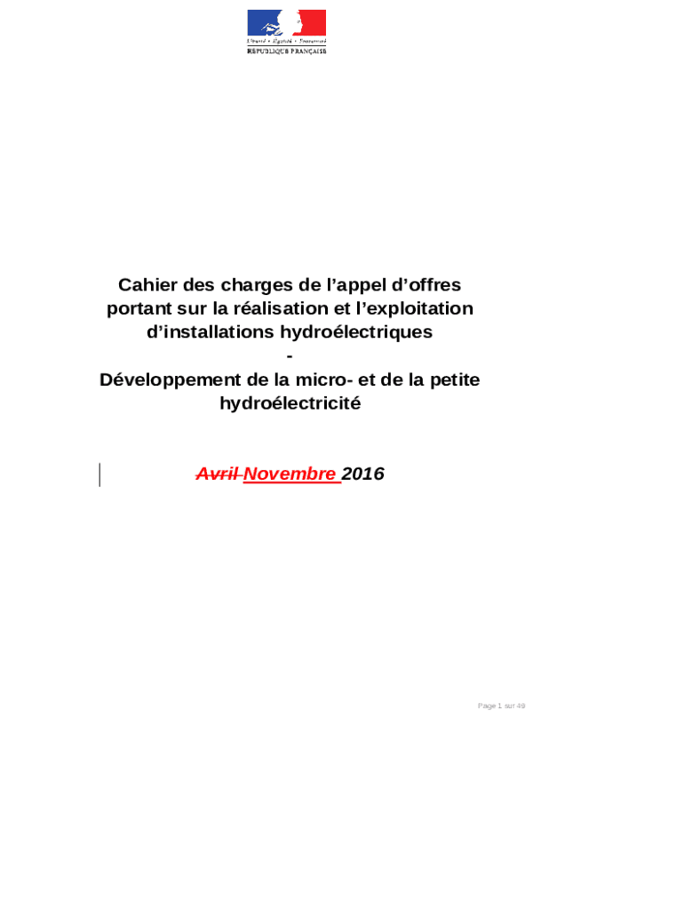 Cahier des charges de lappel doffres portant sur la ralisation et lexploitation dinstallations hydrolectriques Dveloppement de la micro et de la petite hydrolectricitAvril Novembre 2016Page 1 sur