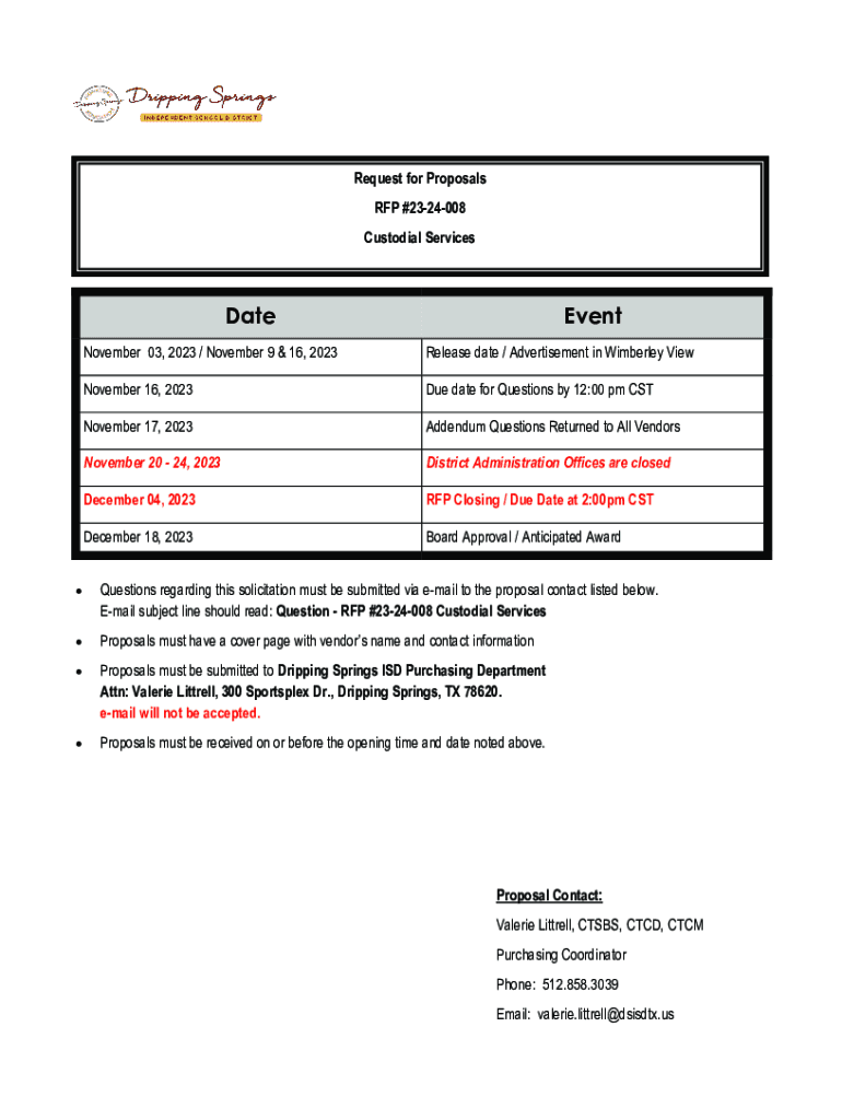 Request for Proposals RFP #2324008 Custodial ServicesDateEventNovember 03, 2023 / November 9 & 16, 2023Release date / Advertisement in Wimberley ViewNovember 16, 2023Due date for Questions by 12:00