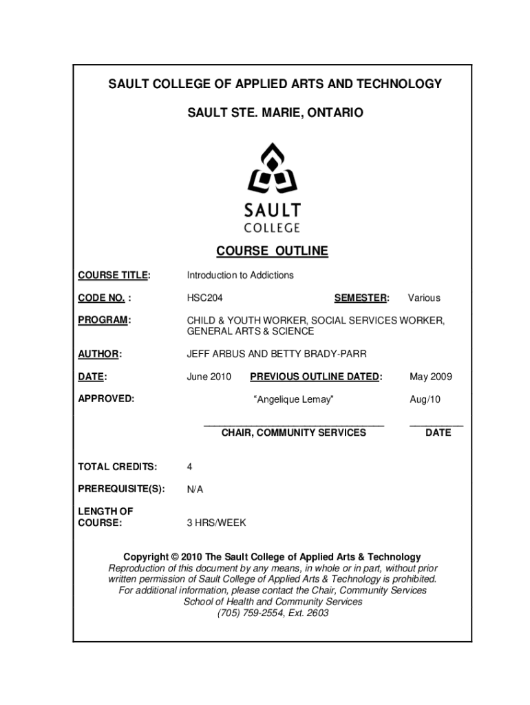 SAULT COLLEGE OF APPLIED ARTS AND TECHNOLOGY SAULT STE. MARIE, ONTARIOCOURSE OUTLINE COURSE TITLE:Introduction to AddictionsCODE NO. :HSC204PROGRAM:CHILD & YOUTH WORKER, SOCIAL SERVICES WORKER, GENERAL