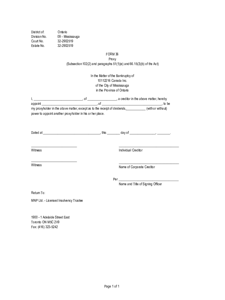 District of: Division No. Court No. Estate No.Ontario 09 Mississauga 322902519 322902519 FORM 36 Proxy (Subsection 102(2) and paragraphs 51(1)(e) and 66.15(3)(b) of the Act) In the Matter of the Bankruptcy