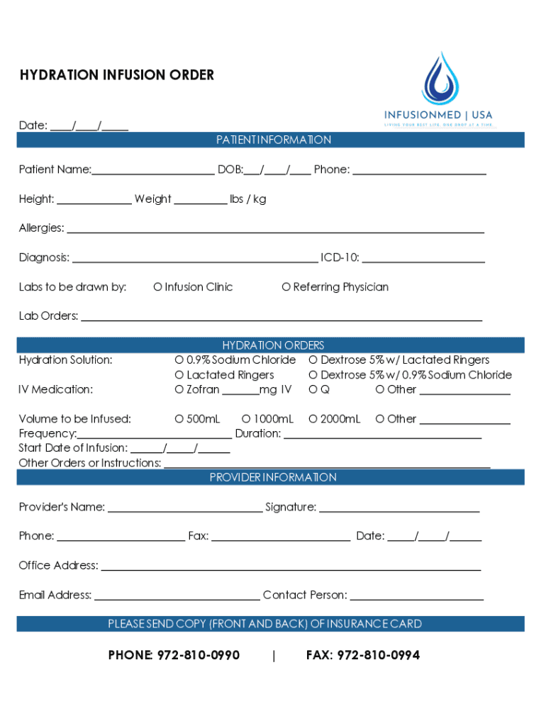 HYDRATION INFUSION ORDER Date: ___/___/___ PATIENT INFORMATION Patient Name:___ DOB:___/___/___ Phone: ___ Height: ___ Weight ___ lbs / kg Allergies: ___ Diagnosis: ___ ICD10: ___ Labs to be drawn