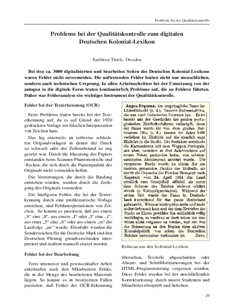 Probleme bei der QualittskontrolleProbleme bei der Qualittskontrolle zum digitalen Deutschen KolonialLexikon Kathleen Thiele, Dresden Bei den ca. 3000 digitalisierten und bearbeiten Seiten des Deutschen