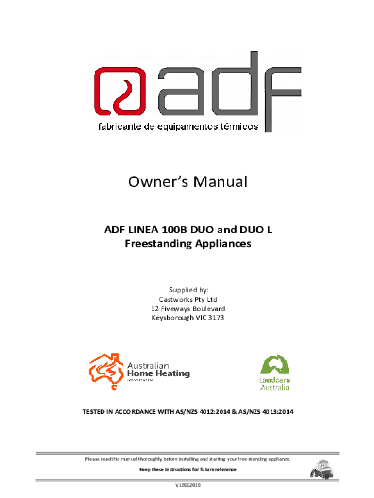 Owners Manual ADF LINEA 100B DUO and DUO L Freestanding AppliancesSupplied by: Castworks Pty Ltd 12 Fiveways Boulevard Keysborough VIC 3173TESTED IN ACCORDANCE WITH AS/NZS 4012:2014 & AS/NZS 4013:2014Please