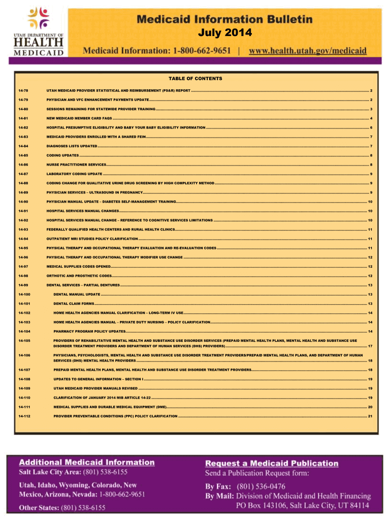 July 2014 TABLE OF CONTENTS 1478 UTAH MEDICAID PROVIDER STATISTICAL AND REIMBURSEMENT (PSR) REPORT ......................................................................................................................................................................