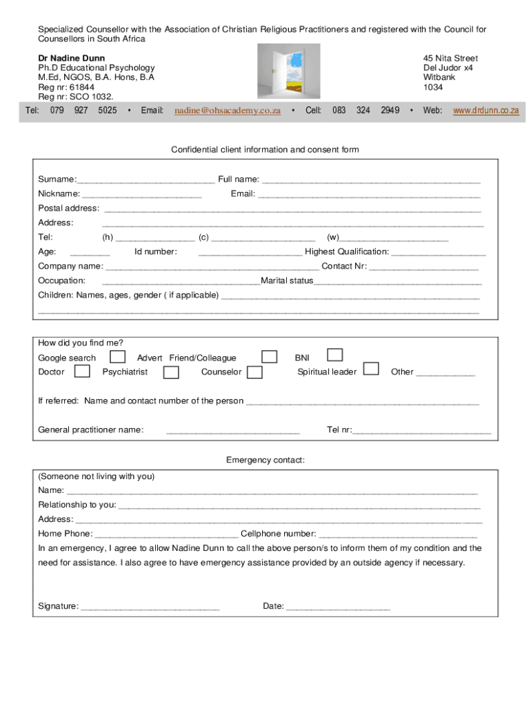 Specialized Counsellor with the Association of Christian Religious Practitioners and registered with the Council for Counsellors in South Africa Dr Nadine Dunn Ph.D Educational Psychology M.Ed, NGOS,