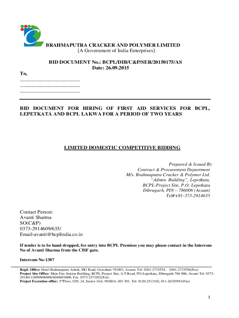 BRAHMAPUTRA CRACKER AND POLYMER LIMITED [A Government of India Enterprises] BID DOCUMENT No.: BCPL/DIB/C&P/SER/20150175/AS Date: 26.09.2015 To, ___ ___ ___BID DOCUMENT FOR HIRING OF FIRST AID SERVICES