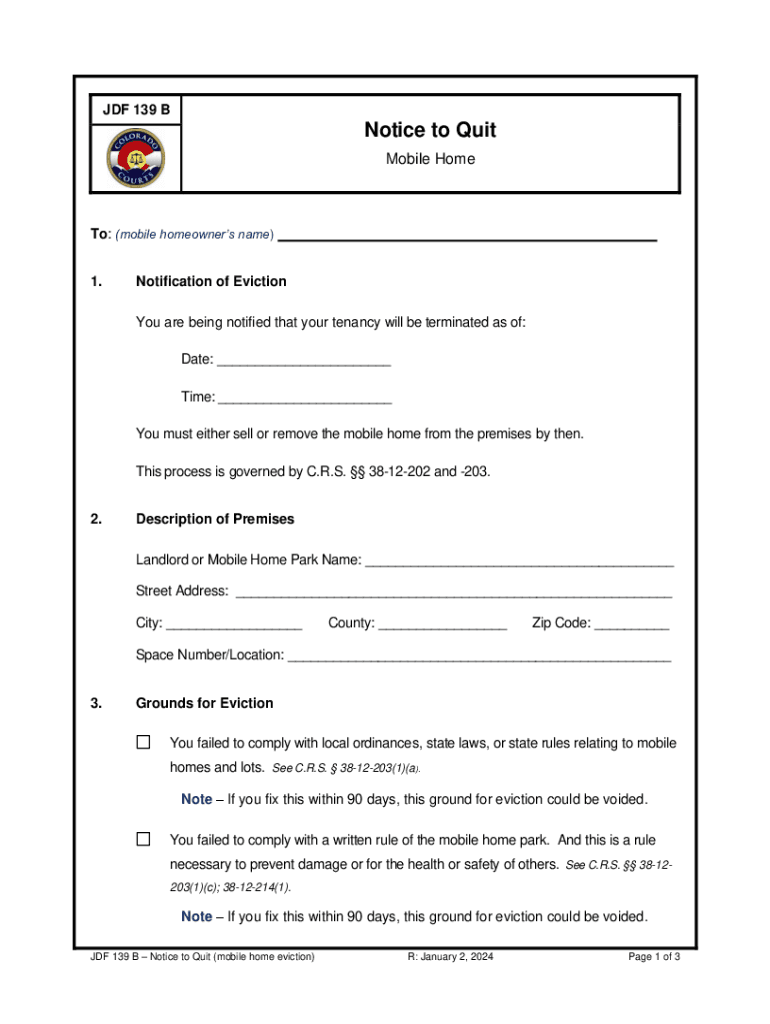 JDF 139 BNotice to Quit Mobile HomeTo: (mobile homeowners name) 1.Notification of Eviction You are being notified that your tenancy will be terminated as of: Date: ___ Time: ___ You must either sell