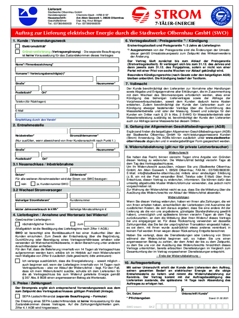 Lieferant Stadtwerke Olbernhau GmbH Handelsregister: Chemnitz Stadt HRB 6197 Hausanschrift: Am Alten Gaswerk 1, 09526 Olbernhau Geschftsfhrer: Dipl.Ing. Knut Bttger Tel.: 037360/660033 Fax: 037360/660039Auftrag