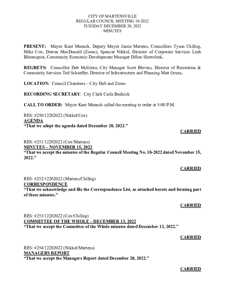 CITY OF MARTENSVILLE REGULAR COUNCIL MEETING 192022 TUESDAY DECEMBER 20, 2022 MINUTESPRESENT: Mayor Kent Muench, Deputy Mayor Jamie Martens, Councillors Tyson Chillog, Mike Cox, Darren MacDonald (Zoom),