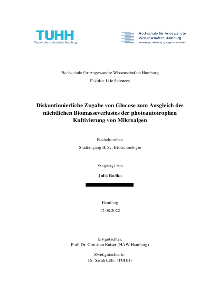 Hochschule fr Angewandte Wissenschaften Hamburg Fakultt Life SciencesDiskontinuierliche Zugabe von Glucose zum Ausgleich des nchtlichen Biomasseverlustes der photoautotrophen Kultivierung von MikroalgenBachelorarbeit