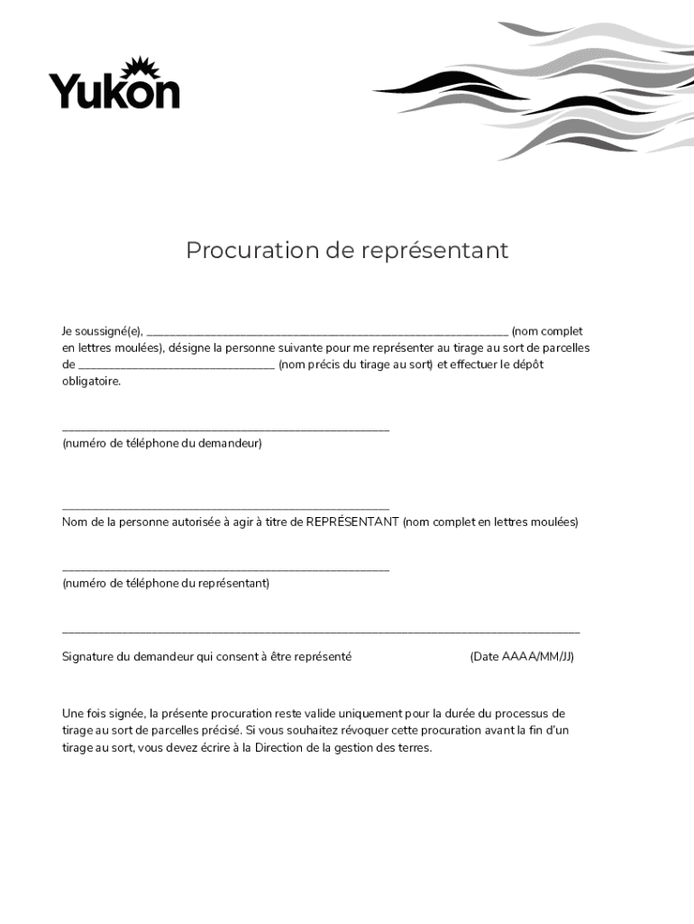 Procuration de reprsentantJe soussign(e), ___ (nom complet en lettres moules), dsigne la personne suivante pour me reprsenter au tirage au sort de parcelles de ___ (nom prcis du tirage au sort) et
