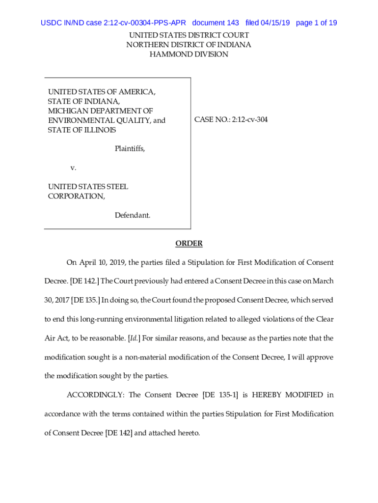 USDA IN/ND case 2:12cv00304PPSAPR document 143 filed 04/15/19 page 1 of 19 UNITED STATES DISTRICT COURT NORTHERN DISTRICT OF INDIANA HAMMOND DIVISIONUNITED STATES OF AMERICA, STATE OF INDIANA, MICHIGAN