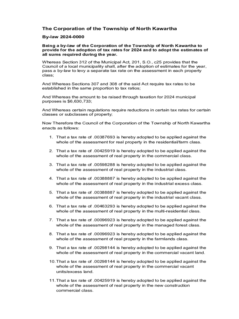 The Corporation of the Township of North Kawartha Bylaw 20240000 Being a bylaw of the Corporation of the Township of North Kawartha to provide for the adoption of tax rates for 2024 and to adopt the