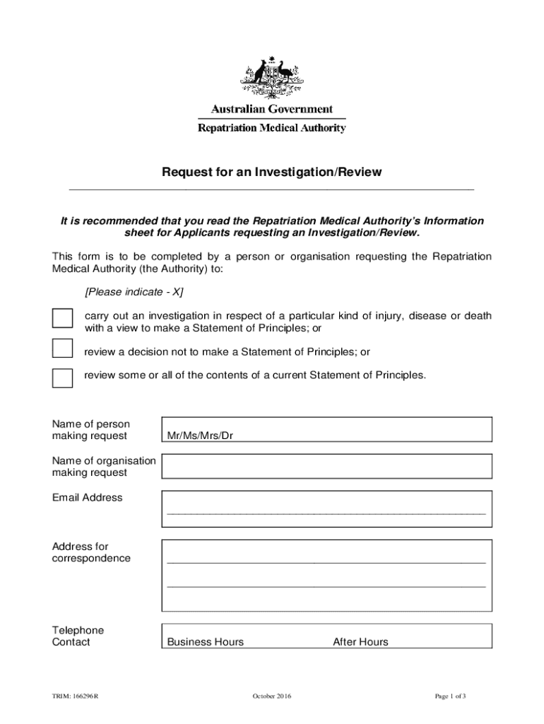Request for an Investigation/Review ___It is recommended that you read the Repatriation Medical Authoritys Information sheet for Applicants requesting an Investigation/Review. This form is to be completed