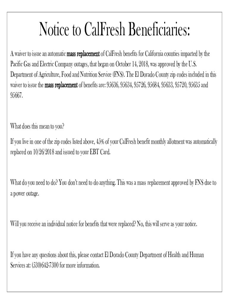 Notice to Afresh Beneficiaries: A waiver to issue an automatic mass replacement of Afresh benefits for California counties impacted by the Pacific Gas and Electric Company outages, that began on October