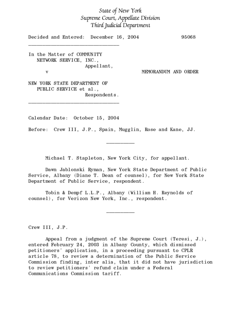 State of New York Supreme Court, Appellate Division Third Judicial Department Decided and Entered: December 16, 2004 ___ In the Matter of COMMUNITY NETWORK SERVICE, INC., Appellant, v95068MEMORANDUM