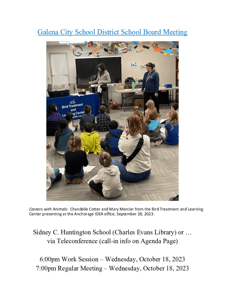 Galena City School District School Board MeetingCareers with Animals: Chantelle Cotter and Mary Mercier from the Bird Treatment and Learning
