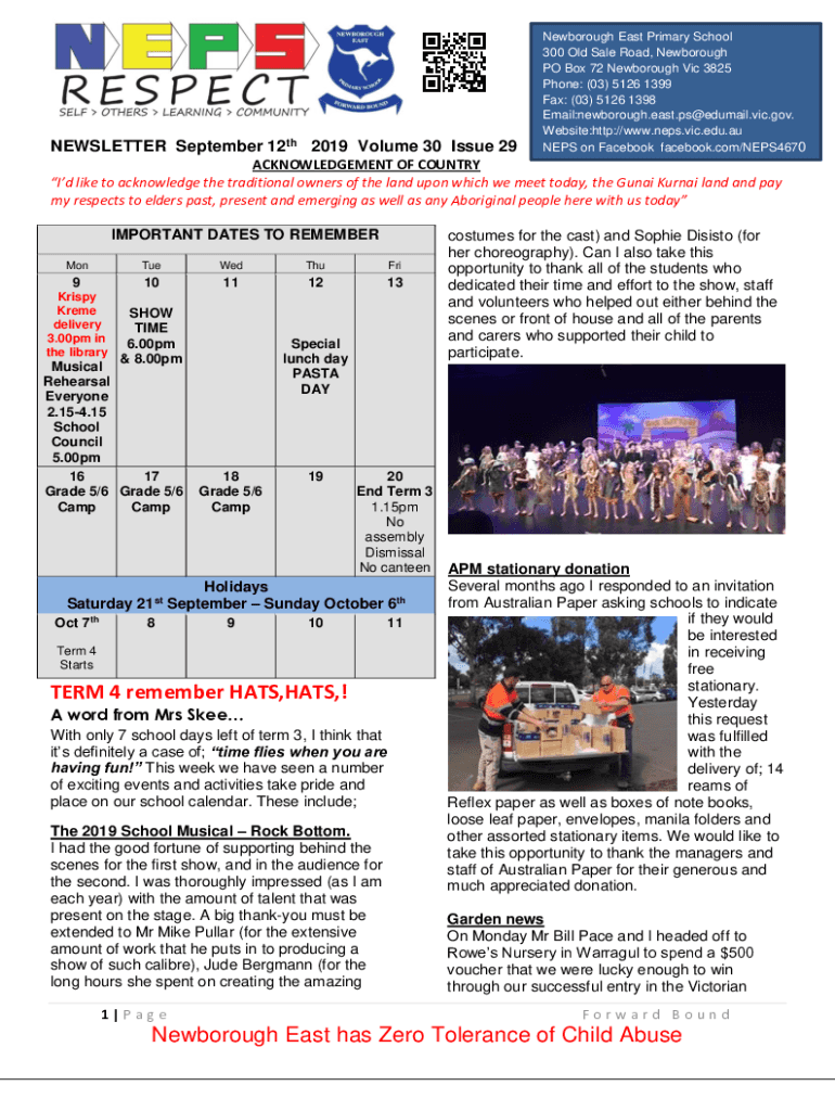 NEWSLETTER September 12th 2019 Volume 30 Issue 29Newborough East Primary School 300 Old Sale Road, Newborough PO Box 72 Newborough Vic 3825 Phone: (03) 5126 1399 Fax: (03) 5126 1398 Email:Newborough.east.ps@edumail.vic.gov.