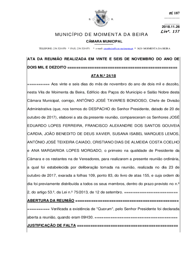 Fl. 187 ___ ___2018.11.26MU NI C P I O DE MO I M E N TA DA B E I R AL i v . 1 5 7CMARA MUNICIPAL TELEFONE: 254 520 070 * FAX: 254 520 071* email: cmmbeira@cmmoimenta.pt * 3620 MOIMENTA DA BEIRAATA