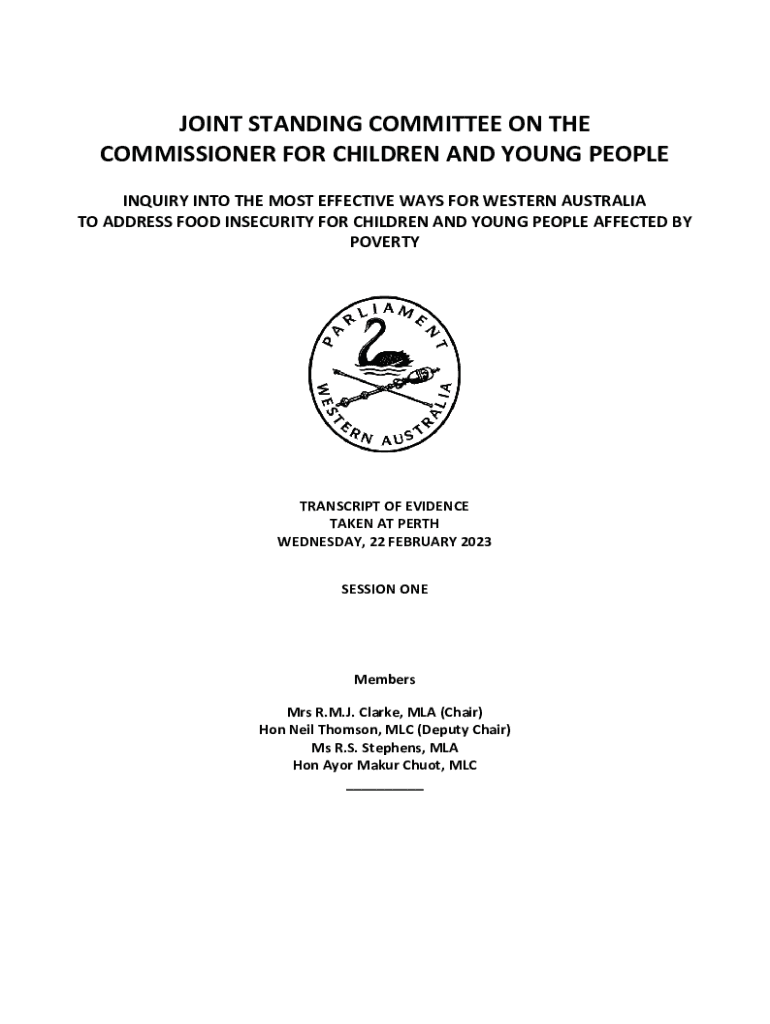 JOINT STANDING COMMITTEE ON THE COMMISSIONER FOR CHILDREN AND YOUNG PEOPLE INQUIRY INTO THE MOST EFFECTIVE WAYS FOR WESTERN AUSTRALIA TO ADDRESS FOOD INSECURITY FOR CHILDREN AND YOUNG PEOPLE AFFECTED