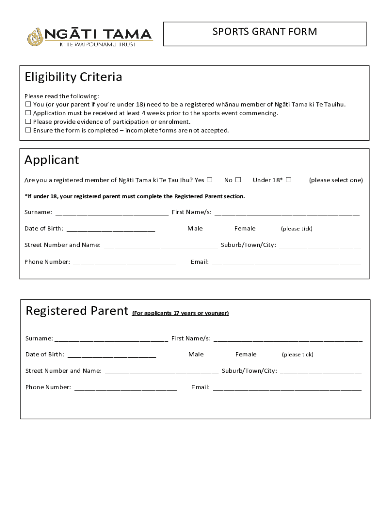 SPORTSGRANTFORM EligibilityCriteria Pleasereadthefollowing: You(oryourparentifyoureunder18)needtobearegisteredwhnaumemberofNgtiTamakiTeTauihu. Applicationmustbereceivedatleast4weekspriortothesportseventcommencing.