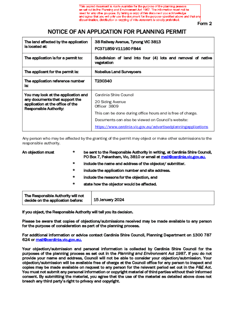 Form 2NOTICE OF AN APPLICATION FOR PLANNING PERMIT The land affected by the application is located at:38 Railway Avenue, Tynong VIC 3813The application is for a permit to:Subdivision of land into