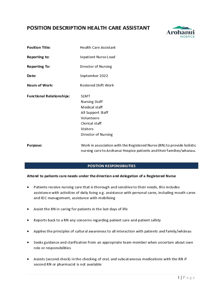 POSITION DESCRIPTION HEALTH CARE ASSISTANTPosition Title:Health Care AssistantReporting to:Inpatient Nurse LeadReporting To:Director of NursingDate:September 2022Hours of Work:Rostered Shift WorkFunctional