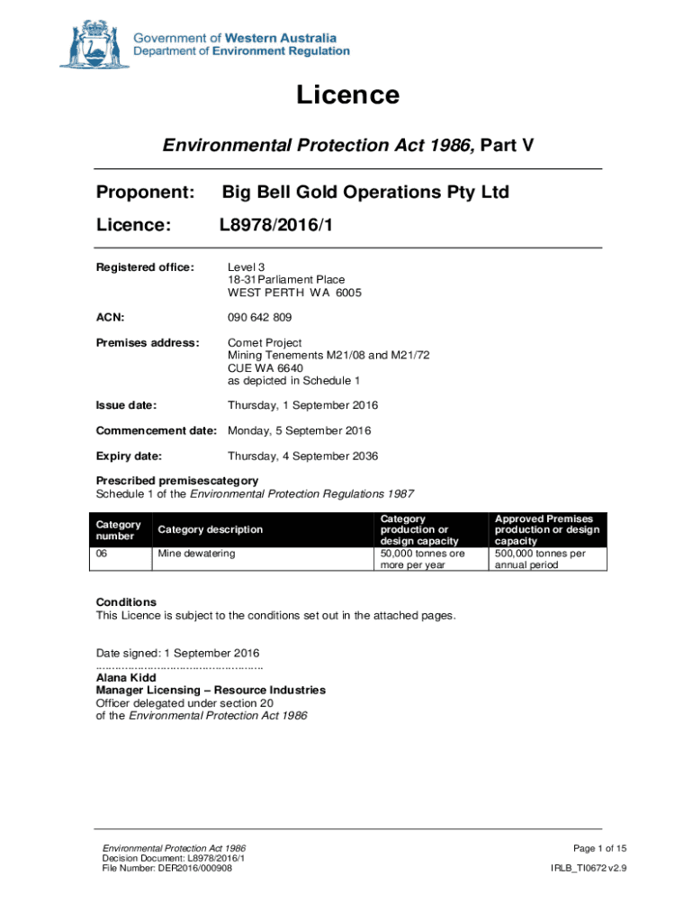 Licence Environmental Protection Act 1986, Part V Proponent:Big Bell Gold Operations Pty LtdLicence:L8978/2016/1Registered office:Level 3 1831Parliament Place WEST PERTH WA 6005ACN:090 642 809Premises