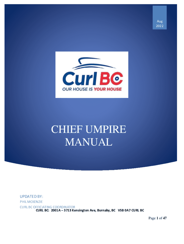 Aug 2022CHIEF UMPIRE MANUALUPDATED BY: PHIL MCKENZIE CURL BC OFFICIATING COORDINATOR CURL BC: 2001A 3713 Kensington Ave, Burnaby, BC V5B 0A7 CURL BC Page 1 of 47OFFICIATING GUIDELINES For Curl BC