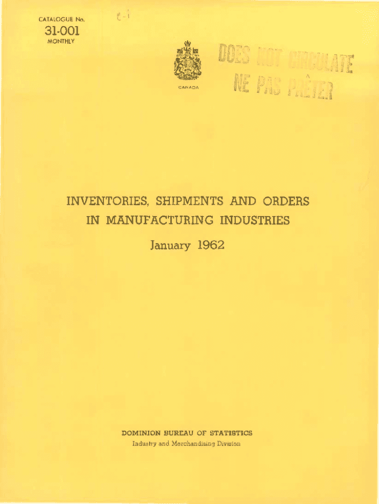 CATALOGUE No.31001 MONTHLYCANADALINVENTORIES, SHIPMENTS AND ORDERS IN MANUFACTURING INDUSTRIES January 1962DOMINION BUREAU OF STATISTICS Industry and Merchandising Division\'I.DOMINION BUREAU OF STATISTICS
