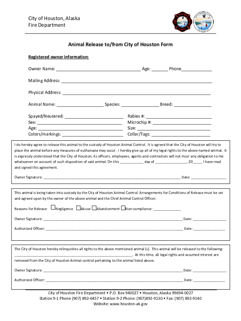 City of Houston, Alaska Fire Department Animal Release to/from City of Houston Form Registered owner information: Owner Name: ___ Age: ___ Phone___ Mailing Address: ___ Physical Address: ___ Animal