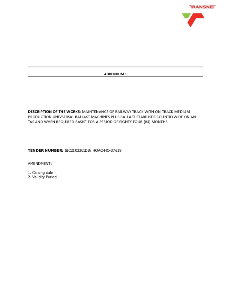 ADDENDUM 1DESCRIPTION OF THE WORKS: MAINTENANCE OF RAILWAY TRACK WITH TRACK MEDIUM