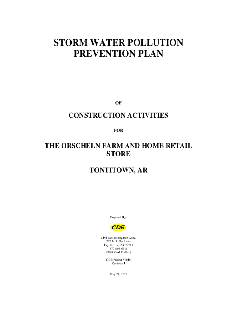 STORM WATER POLLUTION PREVENTION PLANOFCONSTRUCTION ACTIVITIES FORTHE ORSCHELN FARM AND HOME RETAIL STORE TONTITOWN, ARPrepared By:Civil Design Engineers, Inc. 723 N. Lollar Lane Fayetteville, AR