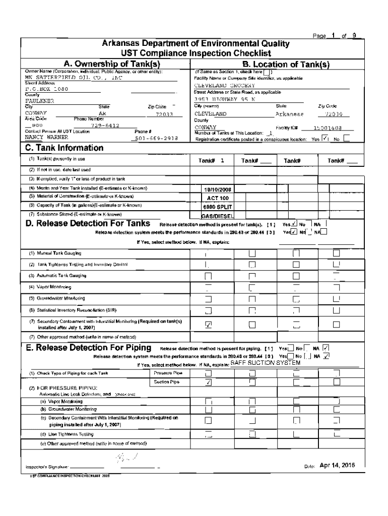 1Paaeof9Arkansas Department of Environmental Quality UST Compliance Inspection Checklist A. Ownership of Tank(s) B. Location of Tank s Owner Name (Corooration. individual. Public Allencv. or other