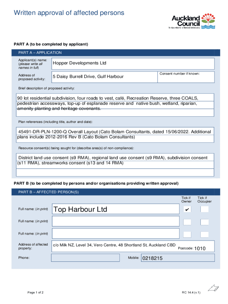 Hopper Developments Limited 35 Daisy Burrell Drive, Gulf Harbour Resource Consent ApplicationAppendix N: Affected Party ApprovalsWritten approval of affected personsPART A (to be completed by applicant)