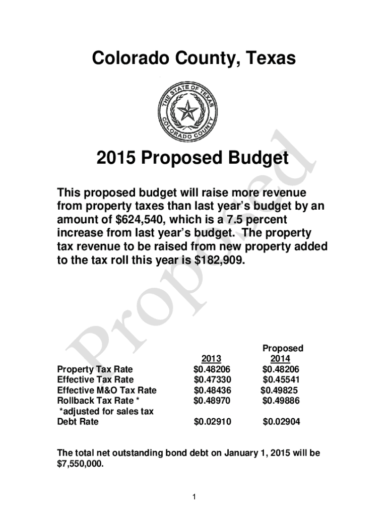 Colorado County, Texas2015 Proposed Budget This proposed budget will raise more revenue from property taxes than last years budget by an amount of $624,540, which is a 7.5 percent increase from last