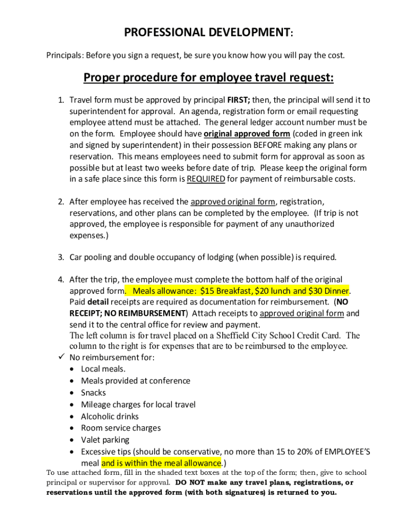PROFESSIONAL DEVELOPMENT: Principals: Before you sign a request, be sure you know how you will pay the cost.Proper procedure for employee travel request: 1. Travel form must be approved by principal