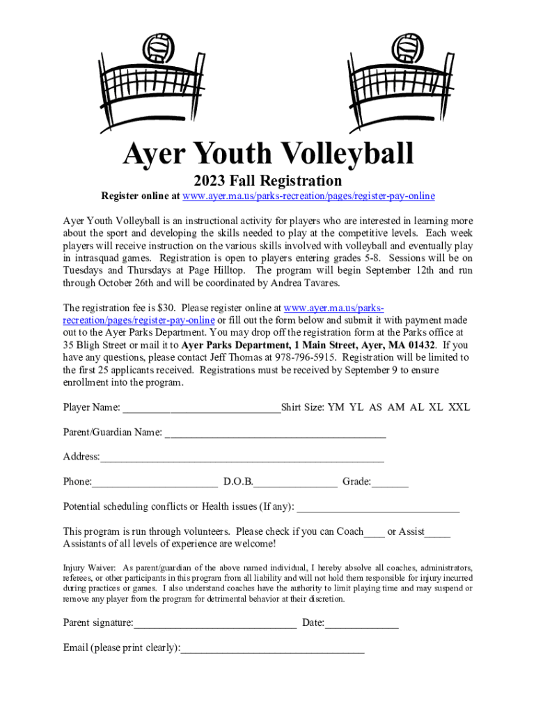 Ayer Youth Volleyball 2023 Fall RegistrationRegister online at www.ayer.ma.us/parksrecreation/pages/registerpayonline Ayer Youth Volleyball is an instructional activity for players who are interested