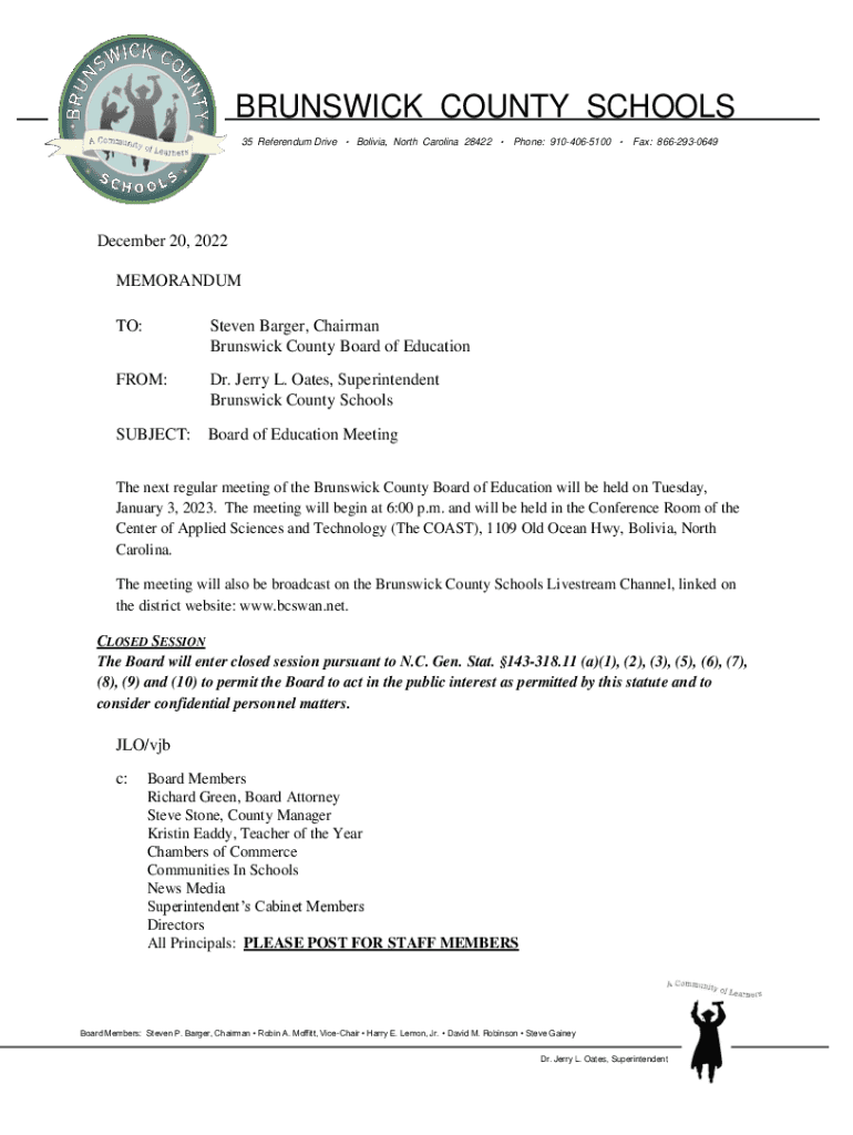 BRUNSWICK COUNTY SCHOOLS 35 Referendum Drive Bolivia, North Carolina 28422 Phone: 9104065100 Fax: 8662930649December 20, 2022 MEMORANDUM TO:Steven Barger, Chairman Brunswick County Board of EducationFROM:Dr.