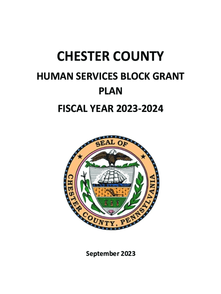 CHESTER COUNTY HUMAN SERVICES BLOCK GRANT PLAN FISCAL YEAR 20232024September 2023Chester County Human Services Block Grant Table of Contents Fiscal Year 20232024Appendix A:Assurance of Compliance1Appendix