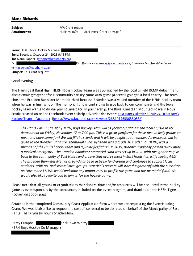 Alana Richards Subject: Attachments:FW: Grant request HERH vs RCMP MEH Event Grant Form.pdfFrom: HERH Boys Hockey Manager Sent: Tuesday, October 24, 2023 9:48 PM To: Alana Tapper atapper@easthants.ca
