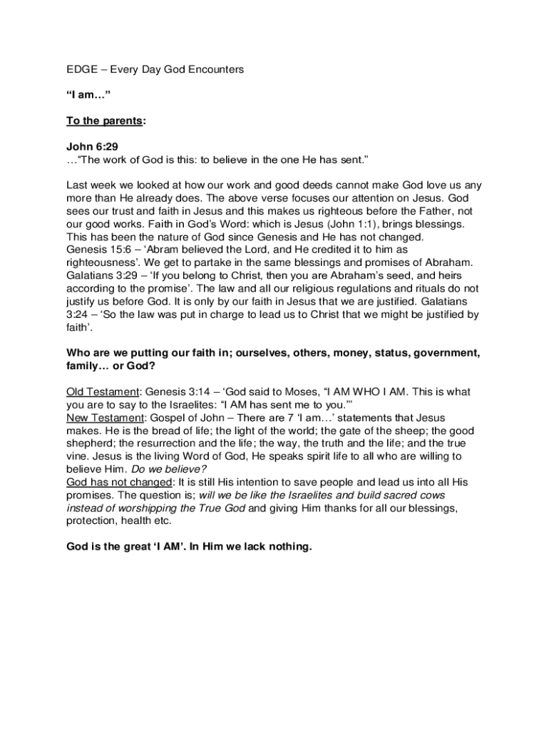 EDGE Every Day God Encounters I am To the parents: John 6:29 The work of God is this: to believe in the one He has sent. Last week we looked at how our work and good deeds cannot make God love us