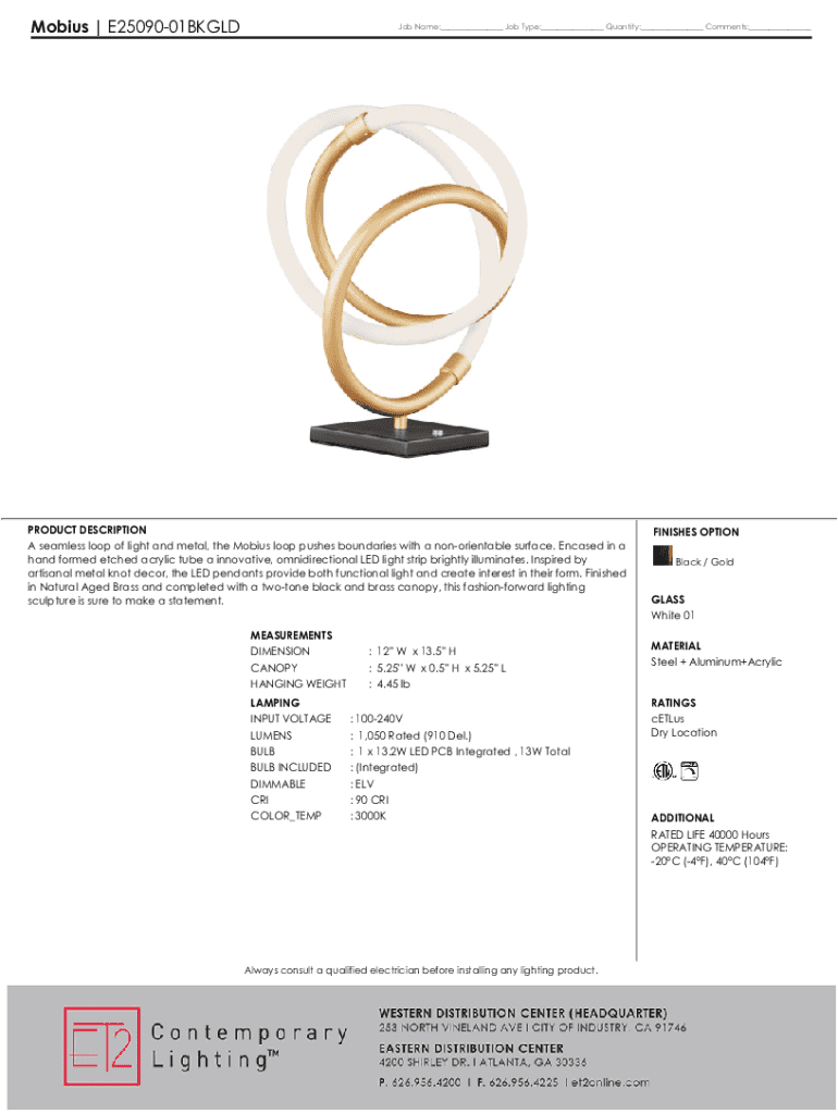Mobius | E2509001BKGLDJob Name:___ Job Type:___ Quantity:___ Comments:___ PRODUCT DESCRIPTIONFINISHES OPTIONA seamless loop of light and metal, the Mobius loop pushes boundaries with a nonorientable